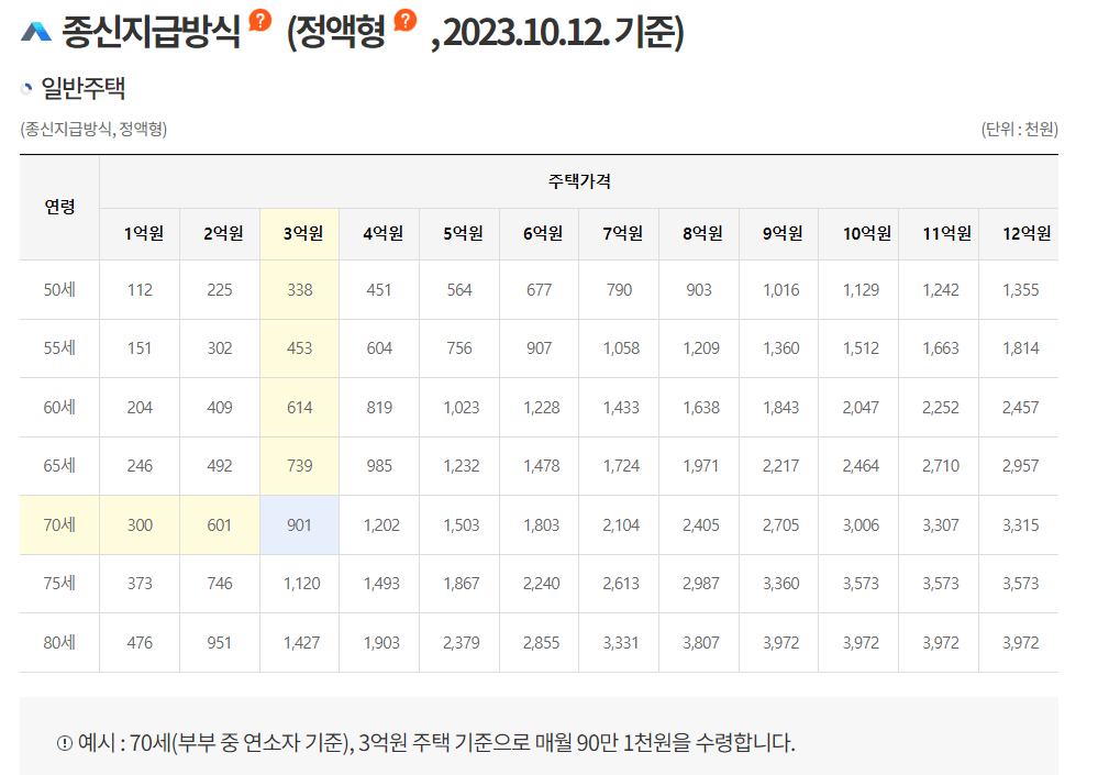 가입자의 연령은 부부 중 연소자 기준으로 합니다. 같은 주택 가격에서 연령이 높을수록 월 연금 지급액이 증가하며, 반대로 연령이 낮을수록 월 지급액은 감소합니다.