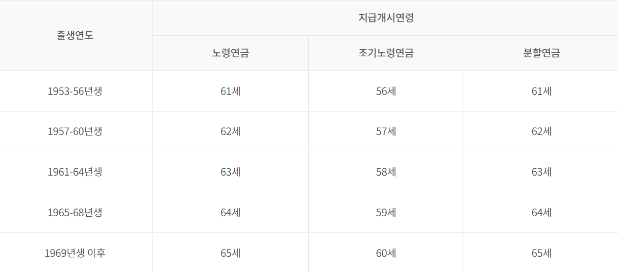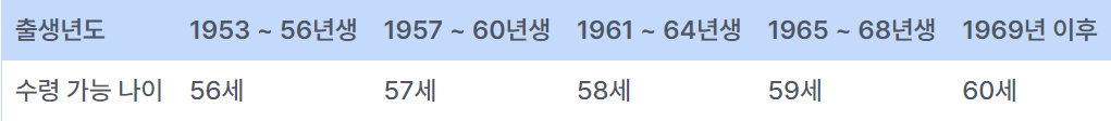 조기 수령의 경우, 일반적인 국민연금과 같이 본인의 출생 연도에 따라 최초로 연금을 받을 수 있는 나이가 달라집니다. 아래 표를 참고하여 자신의 상황에 맞는 정보를 확인해 보세요.